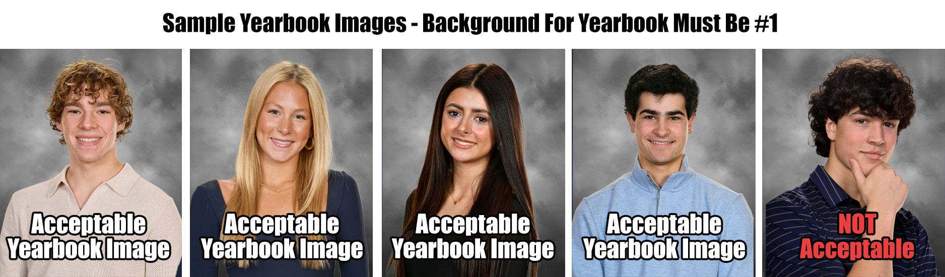 We will retouch facial blemishes and naturally whiten teeth and defects in the background at no charge to you on your free yearbook photo that we submit to the school and any other photos you order !
